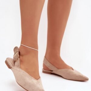 Baleriny damskie wykonane z eko zamszu to stylowy i wygodny wybór na co dzień. Model na płaskim obcasie gwarantuje komfort, a szpiczaste noski dodają elegancji i subtelnie wysmuklają stopę. Z tyłu znajduje się regulowany pasek zakończony dużą, dekoracyjną klamrą, która przyciąga uwagę i stanowi modny akcent. To baleriny idealne do kobiecych, nowoczesnych stylizacji.