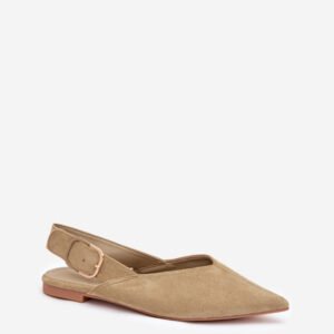 Baleriny damskie wykonane z eko zamszu to stylowy i wygodny wybór na co dzień. Model na płaskim obcasie gwarantuje komfort, a szpiczaste noski dodają elegancji i subtelnie wysmuklają stopę. Z tyłu znajduje się regulowany pasek zakończony dużą, dekoracyjną klamrą, która przyciąga uwagę i stanowi modny akcent. To baleriny idealne do kobiecych, nowoczesnych stylizacji.