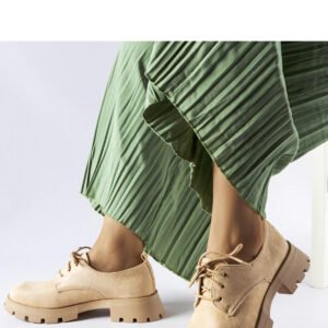 Beżowe półbuty na masywnej podeszwie Coleman to doskonały wybór na letnie dni. Ich trendy design z okrągłym nosem dodaje elegancji i kobiecego uroku. Wykonane z gumy, są nie tylko modne, ale także bardzo wygodne. Niski krój zapewnia odpowiednią wentylację, a sznurowane zapięcie umożliwia regulację dopasowania. Te beżowe półbuty są na czasie i doskonale pasują do różnych letnich stylizacji, dodając im nutkę świeżości i lekkości. Idealne na ciepłe dni!