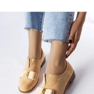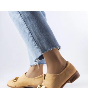 Beżowe półbuty z kokardką Poplar to idealny wybór na letnie dni. Mają płaski obcas i niską cholewkę przed kostkę, co sprawia, że są wygodne i sprawdzą się na co dzień. Dodatkowo ozdobione są kokardką i ćwiekami, co nadaje im unikalnego charakteru. Wykonane z wysokiej jakości zamszowej ekoskóry, a wkładka jest ze skóry naturalnej, co gwarantuje komfort noszenia. Sprawdzą się doskonale w stylizacjach z bluzką z dekoracyjnymi łańcuszkami i skórzaną spódnicą. Numeracja jest standardowa, więc warto kierować się swoim rozmiarem przy zakupie. Podeszwa wykonana jest z gumy w brązowym kolorze, a zapięcie jest wsuwane. Idealne buty na lato!