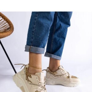 Beżowe sneakersy damskie z brokatem Agar to absolutny hit tego sezonu! Idealne na wiele różnych stylizacji, zarówno casualowych, jak i eleganckich, te buty z pewnością przyciągną uwagę;) Wykonane z wysokiej jakości skóry ekologicznej, zapewniają wygodę i trwałość. Niskie, beżowe podeszwy z gumy zapewniają stabilność i komfort podczas noszenia. Zapięcie na sznurowadła pozwala idealnie dopasować buty do stopy. Must-have w każdej damskiej szafie!