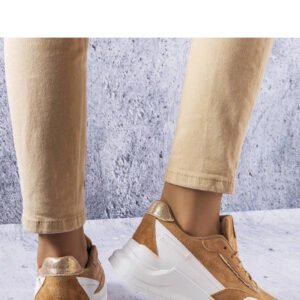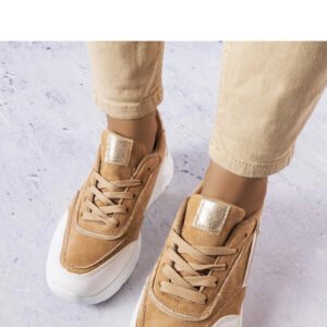 Stylowe beżowe sneakersy z eko-zamszu marki Dupuis to idealna propozycja na letnie dni. Buty posiadają białą gumową podeszwę, która zapewnia komfort i stabilność podczas chodzenia. Zapinane na sznurowadła, doskonale dopasowują się do stopy, zapewniając wygodę przez cały dzień. Idealne na letnią kolekcję, te sneakersy dodadzą stylu i świeżości każdej letniej stylizacji.