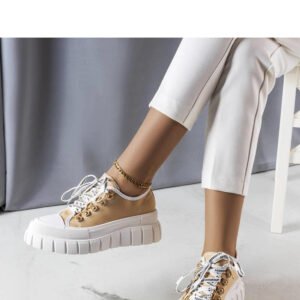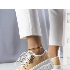 Trampki Toni w kolorze beżowym to idealny wybór dla miłośniczek streetwearowego stylu. Wykonane z wysokiej jakości materiału, posiadają wygodną wkładkę z włókienniczego materiału oraz płaskie, logowane sznurowadła. Ich cholewka sięgająca kostki ozdobiona jest delikatnymi przeszyciami, a gruba podeszwa udekorowana pionowymi żłobieniami dodaje im charakteru. Trampki doskonale sprawdzą się w połączeniu z modnymi jeansami i bluzą oversize. Numeracja standardowa, więc warto kierować się swoim rozmiarem podczas zakupu. Dodatkowo, trampki nie posiadają ocieplenia, a ich podeszwa wykonana jest z białej gumy. To idealna propozycja na lato!
