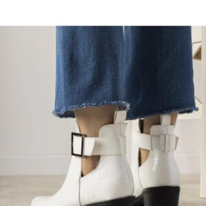 Białe botki na słupku z wycięciami Moderniso Model Moderniso to idealne obuwie dla kobiet, które cenią sobie modny design i wygodę. Botki wykonane są z materiału imitującego skórę krokodyla, co dodaje im elegancji i oryginalności. Buciki są wsuwane, a dopasowanie można regulować za pomocą paska wokół kostki. Wycięcia w cholewce to absolutny hit tej jesieni! Numeracja jest standardowa, więc warto kierować się swoim rozmiarem przy zakupie. Botki posiadają ocieplenie, co sprawia, że będą idealne na chłodniejsze dni. Materiał zewnętrzny to skóra ekologiczna zam, natomiast podeszwa wykonana jest z tworzywa sztucznego w kolorze czarnym. Zapięcie na zamek ułatwia zakładanie i zdejmowanie butów. Botki pochodzą z kolekcji Jesień/Zima, co sprawia, że będą doskonałym uzupełnieniem jesiennej garderoby. Oryginalny wzór i wygoda użytkowania sprawią, że te botki staną się ulubionym obuwiem każdej kobiety.