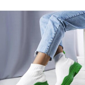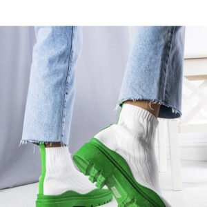 Białe skarpetkowe botki z zieloną podeszwą Cali to propozycja dla osób ceniących sobie wygodę i styl. Botki są wsuwane, wykonane z elastycznej tkaniny, która dopasowuje się do kształtu stopy. Cholewka sięga do połowy łydki i ozdobiona jest paskiem w kolorze podeszwy, co dodaje butom oryginalności. Gruba, kolorowa podeszwa z protektorem zapewnia pewność kroku i komfort noszenia. Buty posiadają okrągły nosek, a numeracja jest standardowa, dlatego warto wybrać swój rozmiar. Idealne na chłodne dni, gdyż posiadają ocieplenie. Botki na masywnej podeszwie to hit ostatnich sezonów, który z pewnością doda charakteru każdej stylizacji.