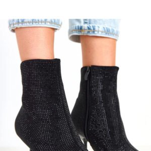 Olśniewające botki damskie na szpilce wykonane z miękkiej, ekologicznej skóry zamszowej. Model zachwyca eleganckim fasonem oraz wykończeniem, cała powierzchnia buta została pokryta błyszczącymi cyrkoniami, które pięknie odbijają światło i nadają butom wyjątkowy, wieczorowy charakter. Smukły szpiczasty nosek oraz 9-centymetrowy obcas typu szpilka optycznie wydłużają nogi i podkreślają sylwetkę. Cholewka o wysokości 14 cm delikatnie obejmuje kostkę, a zapięcie na zamek gwarantuje wygodę zakładania. Wnętrze wykończone jest miękką tkaniną, co zapewnia komfort w trakcie noszenia. To idealny wybór dla kobiet, które cenią elegancję i blask, doskonałe do stylizacji wieczorowych, koktajlowych czy na specjalne okazje.