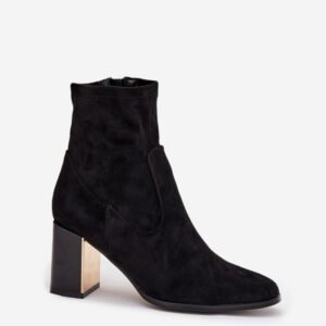 Botki damskie z eko zamszu to stylowe obuwie idealne na chłodniejsze dni. Wygodne zapięcie na zamek ułatwia zakładanie, a ocieplane wnętrze zapewnia ciepło i komfort noszenia. Model osadzony jest na stabilnym obcasie typu słupek, ozdobionym złotym elementem, który dodaje elegancji i podkreśla nowoczesny charakter butów.