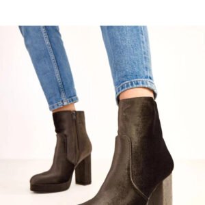 Eleganckie botki za kostkę z delikatnym połyskiem, wykonane z wysokiej jakości ekologicznej skóry zamszowej. Model zachwyca subtelnym blaskiem materiału, który dodaje mu wyjątkowego, kobiecego charakteru. Buty posiadają okrągły nosek oraz stabilny obcas typu słupek o wysokości 11 cm, wsparty platformą 2 cm, co zapewnia wygodę i pewność kroków. Ocieplane wnętrze z tkaninową wkładką gwarantuje komfort nawet w chłodniejsze dni. Dzięki zapięciu na zamek oraz cholewce o wysokości 14 cm, botki doskonale dopasowują się do nogi i pięknie ją wysmuklają. To stylowy model z nutą elegancji, idealny zarówno do codziennych, jak i wieczorowych stylizacji.