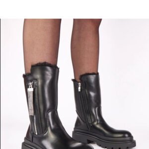 Stylowe botki za kostkę, wykonane z wysokiej jakości ekologicznej skóry, które łączą klasyczny fason z efektownymi detalami. Model wyróżnia się ozdobnym, zewnętrznym zamkiem z cyrkoniami, dodającym butom elegancji i subtelnego blasku. Botki posiadają okrągły nosek oraz stabilną platformę o wysokości 5 cm, która zapewnia wygodę podczas chodzenia i delikatne uniesienie sylwetki. Cholewka o wysokości 20 cm dobrze przylega do nogi, zapewniając komfort i ochronę w chłodniejsze dni. Wnętrze butów zostało wykonane z ocieplanej tkaniny, co gwarantuje ciepło oraz komfort użytkowania. Dodatkowe zapięcie na zamek ułatwia szybkie zakładanie i zdejmowanie obuwia. To klasyczne botki z eleganckim akcentem, idealne do codziennych, jesiennych i zimowych stylizacji.