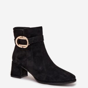 Botki damskie z eko zamszu to stylowy wybór na chłodniejsze dni. Osadzone na stabilnym obcasie typu słupek zapewniają wygodę i subtelnie podkreślają sylwetkę. Zamek boczny ułatwia zakładanie i zdejmowanie, a pasek ze złotą klamrą dodaje im eleganckiego charakteru. Delikatnie zaokrąglone noski. Model ten sprawdzi się w wielu stylizacjach zarówno codziennych, jak i bardziej eleganckich.