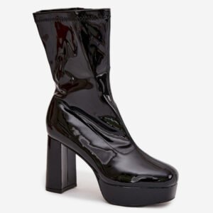 Botki damskie wykonane z eko skóry. Wyróżniają się połyskującym wykończeniem oraz dekoracyjnymi przeszyciami na cholewce, które dodają im charakteru. Osadzone na stabilnym słupkowym obcasie i praktycznej platformie, optycznie wysmuklają sylwetkę, a jednocześnie zapewniają komfort noszenia. Buty zapinane są na zamek, co ułatwia zakładanie i zdejmowanie. Wnętrze zostało ocieplone na wysokości stopy, dzięki czemu sprawdzą się w chłodniejsze dni. To idealny model do stylizacji zarówno ze spodniami, jak i sukienką.