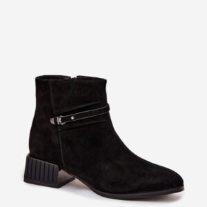Eleganckie botki damskie wykonane z naturalnego zamszu to połączenie klasy i wygody. Model osadzony na stabilnym obcasie typu klocek zapewnia komfort podczas noszenia, a ocieplane wnętrze doskonale sprawdzi się w chłodniejsze dni. Buty zapinane są na zamek, co ułatwia zakładanie. Uroku dodaje im ozdobny paseczek oraz przeszycie biegnące wzdłuż cholewki z przodu, które podkreślają ich stylowy, kobiecy charakter. To doskonały wybór dla kobiet ceniących elegancję w codziennym wydaniu, idealne do pracy, na spotkania i na co dzień.