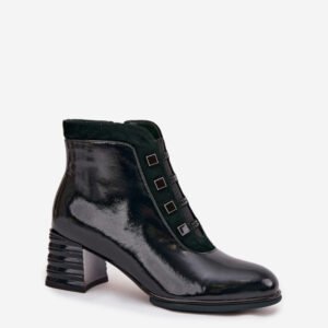 Botki damskie wykonane z naturalnej, lakierowanej skóry to propozycja dla kobiet, które cenią elegancję w nowoczesnym wydaniu. Połyskująca powierzchnia skóry nadaje im wyjątkowego charakteru i sprawia, że świetnie prezentują się zarówno w codziennych, jak i bardziej wyjściowych stylizacjach. Z przodu umieszczono ozdobne detale, które podkreślają unikalny wygląd. Zaokrąglone noski. Zapięcie na zamek ułatwia zakładanie i zdejmowanie. Wnętrze wykończono miękkim w dotyku kocem obuwniczym, który delikatnie ociepla i gwarantuje komfort w chłodniejsze dni. To botki, które doskonale sprawdzą się w sezonie jesienno-zimowym, stanowiąc elegancki i uniwersalny element kobiecej garderoby.
