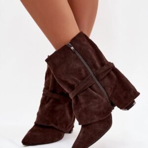 Damskie botki z eko zamszu to idealne połączenie stylu i oryginalnych detali, które przyciągają uwagę. Cholewka nachodząca na obcas subtelnie wysmukla sylwetkę, a szpiczaste noski dodają elegancji i kobiecego charakteru. Model ozdobiony frędzlami oraz cienkimi paseczkami ze złotymi klamrami wprowadza modowy akcent, nadając wyjątkowego, nowoczesnego wyglądu. Botki doskonale sprawdzą się w casualowych zestawach, jak i w bardziej wyjściowych stylizacjach, wprowadzając do nich nutę oryginalności i szyku. Komfortowe i efektowne, stanowią świetny wybór na co dzień i na specjalne okazje.