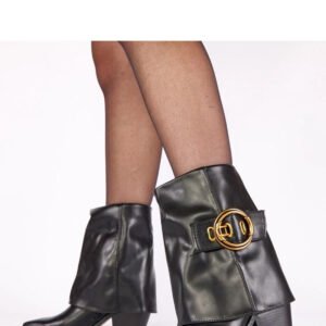 Stylowe botki za kostkę, wykonane z wysokiej jakości ekologicznej skóry, utrzymane w klasycznym stylu bez wzoru. Model wyróżnia się wywiniętą cholewką, która nadaje obuwiu nowoczesnego charakteru, oraz ozdobną klamrą, stanowiącą elegancki akcent podkreślający design butów. Botki posiadają szpiczasty nosek, który optycznie wysmukla stopę i dodaje butom wyrafinowanego wyglądu. Osadzone są na stabilnym słupkowym obcasie o wysokości 7 cm, który zapewnia komfort noszenia oraz delikatne uniesienie sylwetki. Cholewka o wysokości 19 cm świetnie układa się na nodze, gwarantując wygodę i stylowy efekt. Wnętrze botków zostało wyposażone w ocieplenie oraz tkaninową wkładkę, co sprawia, że model idealnie sprawdzi się w chłodniejsze dni. Praktyczne zapięcie na zamek ułatwia zakładanie i zdejmowanie obuwia. To eleganckie, klasyczne botki z nowoczesnym akcentem, idealne do jesiennych i zimowych stylizacji.