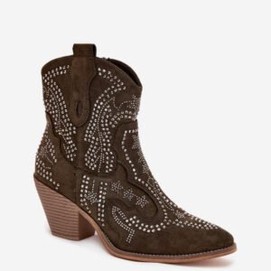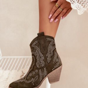 Botki kowbojki damskie z eko zamszu, osadzone na słupkowym obcasie, to modna propozycja na chłodniejsze dni. Zapinane na zamek, zapewniają łatwość zakładania, a zdobienie na cholewce dodaje im charakterystycznego, kowbojskiego stylu. Noski w migdałowym kształcie nadają im subtelności, a ocieplenie kocem obuwniczym gwarantuje komfort i ciepło. Doskonałe do casualowych i boho stylizacji, te botki stanowią idealny wybór na sezon jesienno-zimowy.
