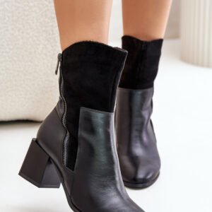 Damskie botki wykonane z eko skóry, osadzone na stabilnym obcasie typu słupek. Zapinane na zamek, z dodatkowym ozdobnym suwakiem, który dodaje charakteru. Wnętrze ocieplone kocem obuwniczym, zapewniającym ciepło i wygodę w chłodniejsze dni. Idealny wybór dla kobiet ceniących styl i komfort.