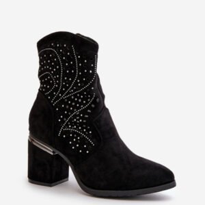 Eleganckie ażurowe botki damskie wykonane z wysokiej jakości eko zamszu. Osadzone na stabilnym słupkowym obcasie. Noski w szpic. Model zapinany na zamek zapewnia wygodę i łatwość zakładania. Idealne na różne okazje, te botki będą stylowym uzupełnieniem Twojej garderoby.