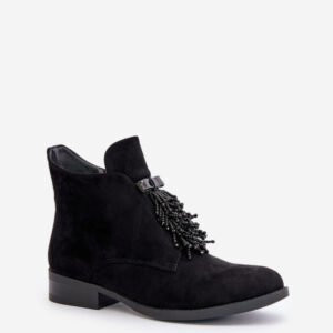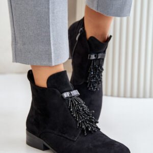 Botki damskie z cholewką do kostki od marki S.Barski. Wykonane z eko zamszu. Osadzone na płaskim obcasie, który zapewni stabilność na każdym kroku. Noski zaokrąglone. Głównym atutem tego modelu jest ozdoba z przodu, która nadaje wyjątkowego uroku. Model ten posiada ocieplenie w postaci koca obuwniczego.
