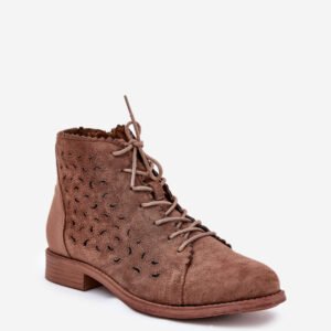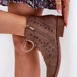 Botki damskie z eko zamszu to stylowa propozycja na chłodniejsze dni. Niska cholewka ozdobiona ażurowym wzorem nadaje im lekkości. Sznurowane i zapinane na zamek, co zapewnia łatwość zakładania oraz dopasowanie do stopy. Te botki będą doskonałym wyborem do codziennych stylizacji, łącząc funkcjonalność z modnym wyglądem.
