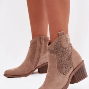 Botki damskie w stylu kowbojek od marki S.Barski to modna propozycja, która świetnie podkreśli charakter wiosennych stylizacji. Wykonane z  eko zamszu. Charakterystycznym elementem tego modelu jest ażurowy wzór na cholewce, który nadaje im lekkości, oryginalności. Botki zostały osadzone na stabilnym, ściętym obcasie, który zapewnia wygodę podczas chodzenia, a jednocześnie dodaje całości stylowego wykończenia inspirowanego westernowym klimatem. Migdałowe noski optycznie wysmuklają stopę i podkreślają kobiecy charakter butów. To model, który doskonale sprawdzi się zarówno w codziennych, casualowych zestawach, jak i w bardziej wyrazistych stylizacjach z nutą boho.