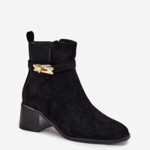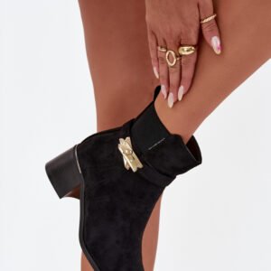 Botki damskie wykonane z eko zamszu to doskonała propozycja na chłodniejsze dni. Osadzone na obcasie w formie klocka, zapewniają stabilność i wygodę przez cały dzień. Środek ocieplany kocem obuwniczym gwarantuje ciepło i komfort. Noski zaokrąglone. Cholewka ozdobiona paseczkiem ze złotą ozdobą dodaje wyjątkowego akcentu, sprawiając, że będą doskonałym uzupełnieniem eleganckich zimowych stylizacji.