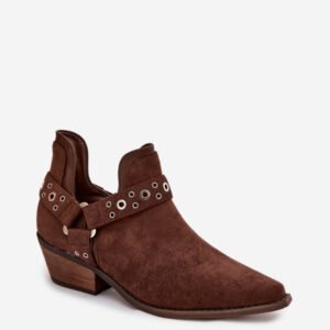 Stylowe botki damskie wykonane z eko zamszu. Osadzone na niskim, ciętym obcasie zapewniają stabilność i komfort noszenia, a szpiczaste noski optycznie wysmuklają stopę. Cholewka z dekoracyjnymi paskami oraz efektownymi wycięciami nadaje modnego, oryginalnego charakteru. Wsuwany model ułatwia szybkie zakładanie, dzięki czemu botki świetnie sprawdzą się zarówno w codziennych, jak i bardziej eleganckich stylizacjach.