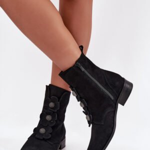 Botki damskie z naturalnego zamszu to doskonały wybór dla kobiet ceniących elegancję i subtelność. Wykonane z wysokiej jakości materiału, oferują nie tylko estetyczny wygląd, ale także komfort noszenia przez cały dzień. Zapinane na zamek błyskawiczny. Przód buta ozdobiony jest pięknymi, urokliwymi kwiatkami, które nadają im niepowtarzalnego, delikatnego charakteru. Dzięki temu stanowią doskonały dodatek do zarówno codziennych, jak i bardziej eleganckich stylizacji. Świetnie komponują się z sukienkami, spódnicami czy spodniami.
