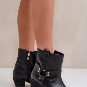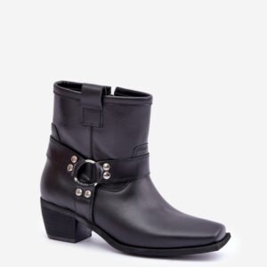Damskie botki z naturalnej skóry to stylowy model, idealny na chłodniejsze dni. Osadzone na stabilnym obcasie typu słupek, zapewniają wygodę i subtelnie wydłużają sylwetkę. Zapinane na zamek dla łatwego zakładania, a zaokrąglone noski z kwadratową podeszwą nadają im nowoczesnego charakteru. Cholewkę zdobią paski z ozdobnym elementem, co dodaje elegancji i przyciąga wzrok. Te wyjątkowe botki doskonale sprawdzą się zarówno w casualowych, jak i bardziej formalnych stylizacjach, łącząc wygodę z modnym designem.