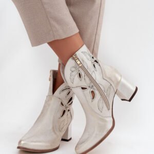 Botki damskie wykonane z naturalnej skóry. Ażurowy wzór dodaje im oryginalności i lekkości, podkreślając wyjątkowy charakter tego modelu. Obcas typu słupek zapewnia stabilność i wygodę, a jednocześnie pięknie wydłuża sylwetkę. Szpiczaste noski wprowadzają elegancki akcent, sprawiając, że buty prezentują się niezwykle zgrabnie. Dzięki zapięciu na zamek są łatwe w zakładaniu i zdejmowaniu, co zwiększa komfort codziennego użytkowania. To obuwie idealne na sezon przejściowy, które świetnie uzupełni zarówno casualowe, jak i bardziej eleganckie zestawy.