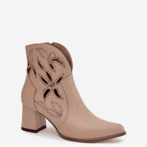 Botki damskie wykonane z naturalnej skóry. Ażurowy wzór dodaje im oryginalności i lekkości, podkreślając wyjątkowy charakter tego modelu. Obcas typu słupek zapewnia stabilność i wygodę, a jednocześnie pięknie wydłuża sylwetkę. Szpiczaste noski wprowadzają elegancki akcent, sprawiając, że buty prezentują się niezwykle zgrabnie. Dzięki zapięciu na zamek są łatwe w zakładaniu i zdejmowaniu, co zwiększa komfort codziennego użytkowania. To obuwie idealne na sezon przejściowy, które świetnie uzupełni zarówno casualowe, jak i bardziej eleganckie zestawy.