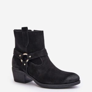 Botki damskie wykonane z naturalnego zamszu. Osadzone na niskim obcasie. Noski w migdał. Środek ocieplany filcem, co zapewni ciepło w chłodniejsze dni. Zapinane na zamek. Na cholewce paski. Model ten idealnie sprawdzi się zarówno do spodni, jak i sukienek.