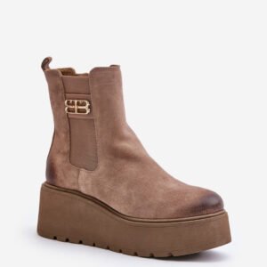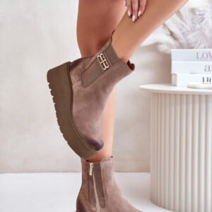 Damskie botki wykonane z naturalnego zamszu to stylowa propozycja na chłodniejsze dni. Osadzone na masywnej platformie z koturnem, zapewniają komfort i stabilność. Zamek umieszczony z boku cholewki ułatwia zakładanie, a usztywniany zapiętek dodaje butom trwałości i wsparcia. Wnętrze ocieplone filcem gwarantuje ciepło, a ozdobny element na cholewce podkreśla ich wyjątkowy charakter. Ten model będzie doskonałym uzupełnieniem różnorodnych stylizacji.