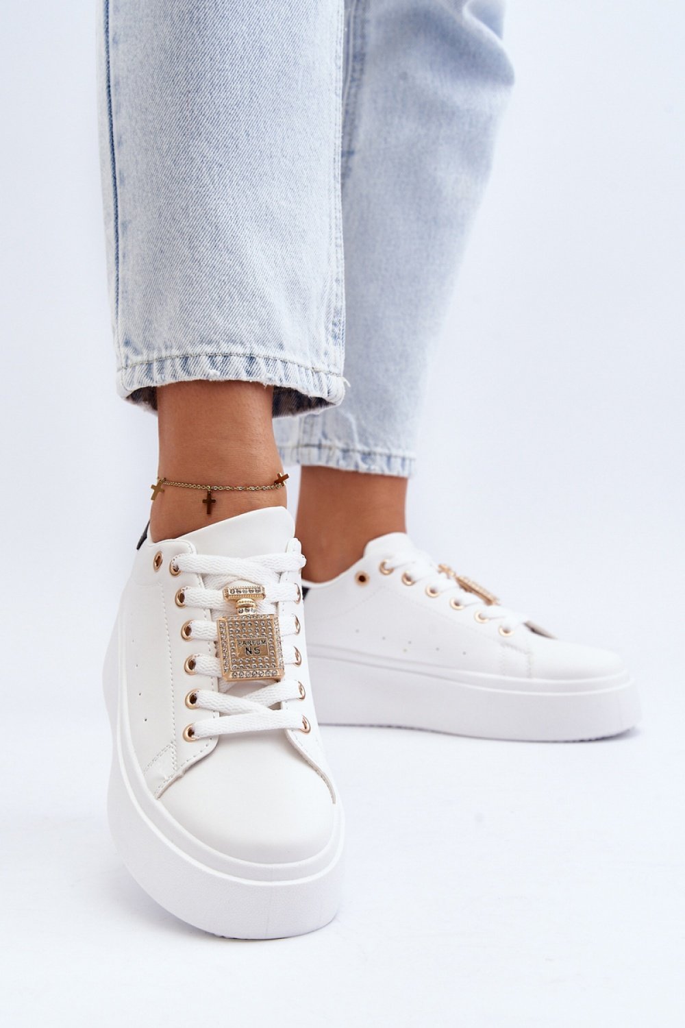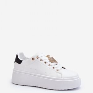 Damskie buty sportowe zostały wykonane z eko skóry. Osadzone na platformie. Model ten jest klasycznie sznurowany. Świetnie sprawdzą się jako obuwie na co dzień, do pracy czy szkoły. Wkładka z pianki zadba o Twój komfort. Na sznurówkach ozdoba w postaci perfum. Ten model powinien znaleźć się w Twojej szafie!