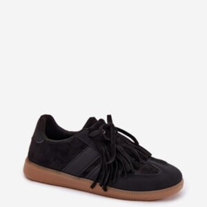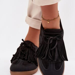Stylowe sneakersy damskie z eko zamszu to oryginalna propozycja dla kobiet ceniących modny wygląd i wygodę. Przód buta zdobią dekoracyjne frędzle, które można w łatwy sposób zdjąć, dzięki czemu model zyskuje uniwersalny charakter. Miękka wkładka z pianki, dodatkowo pokryta materiałem, zapewnia komfort noszenia przez cały dzień. Te sneakersy doskonale sprawdzą się w codziennych, miejskich stylizacjach.