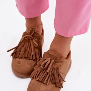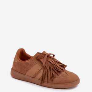 Stylowe sneakersy damskie z eko zamszu to oryginalna propozycja dla kobiet ceniących modny wygląd i wygodę. Przód buta zdobią dekoracyjne frędzle, które można w łatwy sposób zdjąć, dzięki czemu model zyskuje uniwersalny charakter. Miękka wkładka z pianki, dodatkowo pokryta materiałem, zapewnia komfort noszenia przez cały dzień. Te sneakersy doskonale sprawdzą się w codziennych, miejskich stylizacjach.