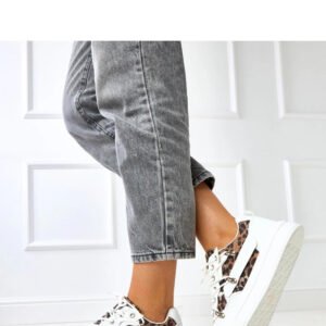 Modne buty sportowe o niskim fasonie, które wyróżniają się stylowymi, panterkowymi wstawkami. Wykonane ze skóry ekologicznej, łączą wygodę i nowoczesny design. Klasyczny, okrągły nosek oraz sznurowane zapewniają dobre dopasowanie do stopy i komfort noszenia. Model osadzony na stabilnej platformie o wysokości 4 cm, która dodaje lekkości krokowi i sprawia, że obuwie świetnie prezentuje się w codziennych stylizacjach. Idealne dla kobiet, które lubią sportowy styl z nutą drapieżnej elegancji.