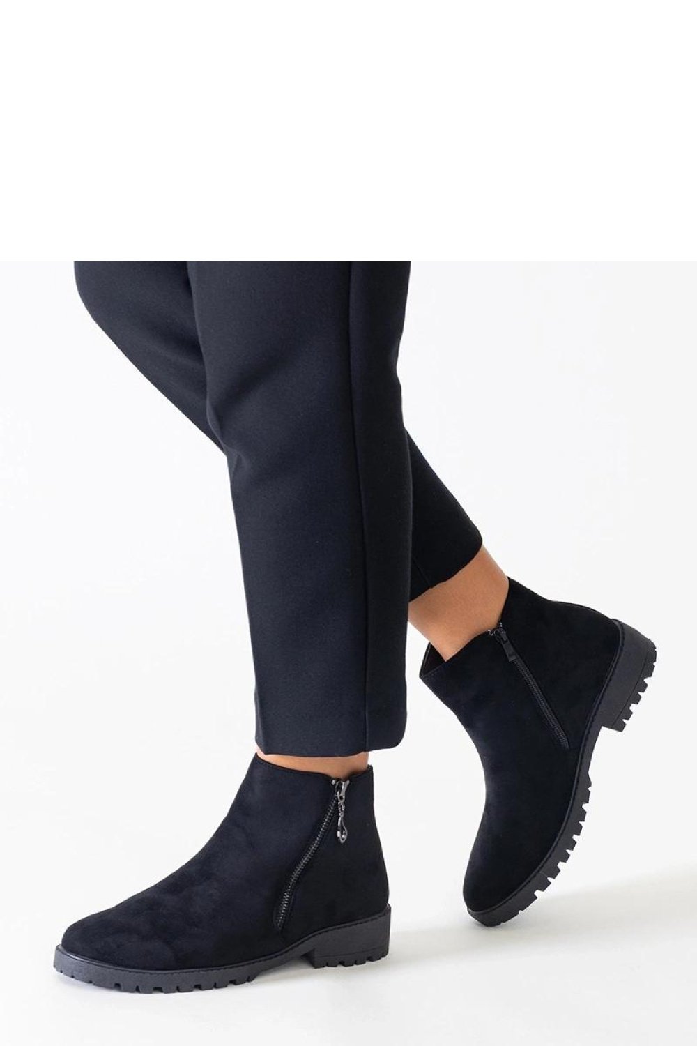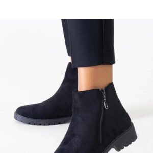 Czarne botki z metalowymi wstawkami wykonane z eko-zamszu marki Branda to propozycja dla kobiet ceniących nowoczesny design i wygodę. Mają migdałowy nosek i szpiczasty design, co nadaje im modny wygląd. Płaski obcas gwarantuje komfort nawet podczas długiego noszenia, a wysokość za kostkę dodaje im elegancji. Botki te są doskonałym uzupełnieniem jesienno-zimowej garderoby, dzięki unikalnemu designowi i wysokiej jakości wykonania. Wyposażone w ocieplenie, zapewniają ciepło w chłodne dni. Zapięcie na zamek ułatwia ich zakładanie, a solidna gumowa podeszwa zapewnia stabilność na każdym kroku. Botki są dostępne w kolorze czarnym, idealnie pasującym do wielu stylizacji.