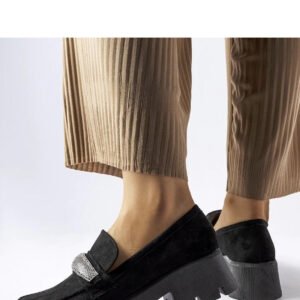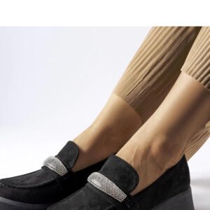 Czarne mokasyny na masywnej podeszwie Macario to idealne połączenie elegancji i wygody. Ich średni obcas dodaje im kobiecego charakteru, a cyrkonie nadają delikatnego blasku. Migdałkowy nosek zapewnia odpowiednio przylegającą konstrukcję, a wsuwany model ułatwia zakładanie i zdejmowanie butów. Mokasyny te są praktyczne i idealne do szybkiego tempa życia we współczesnym świecie. Wykonane z skóry ekologicznej z masywną gumową podeszwą, zapewniają styl, wygodę i funkcjonalność przez cały dzień. Idealne na lato!