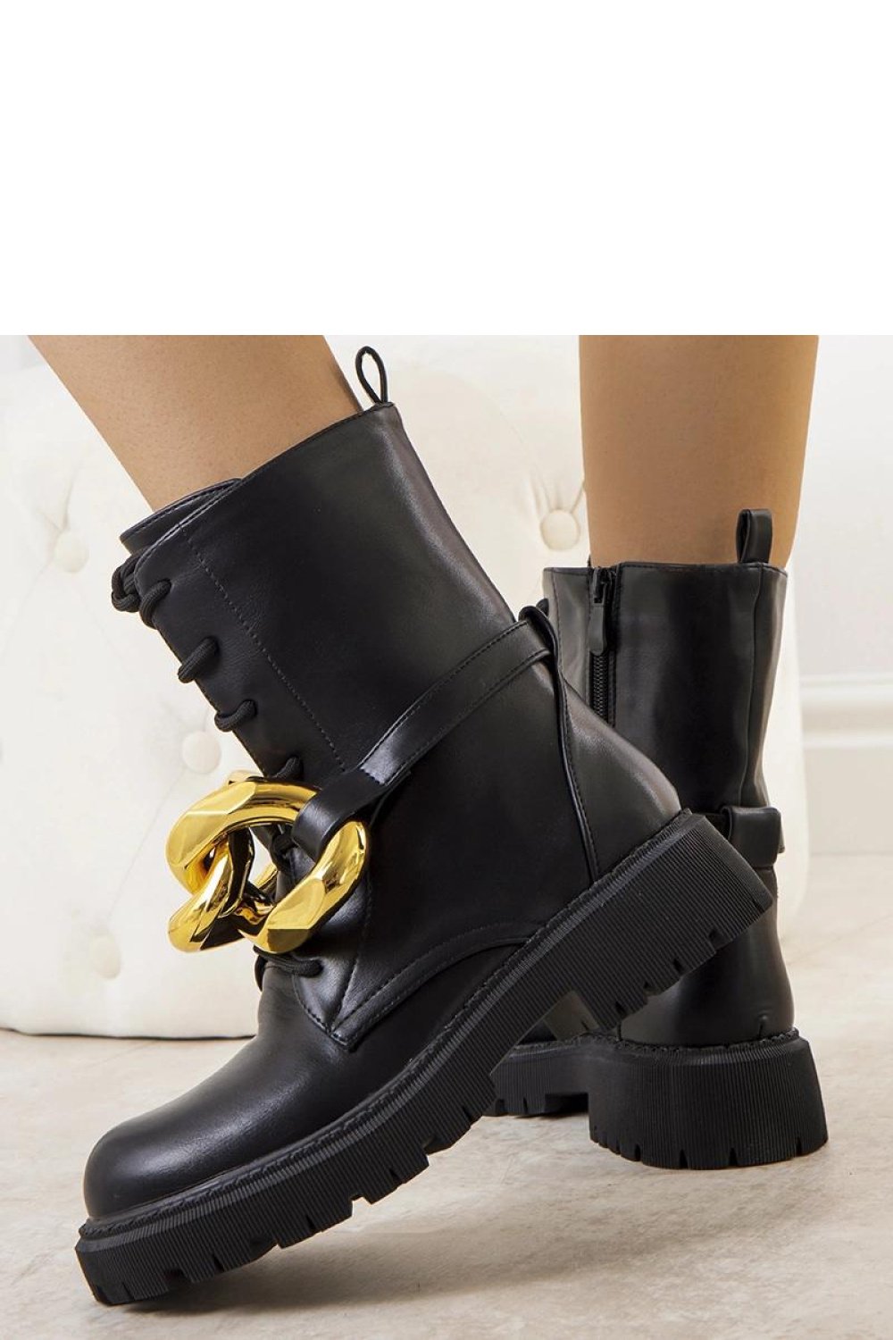 Czarne traperki Galar z łańcuchem to absolutny must-have tego sezonu! Model ten łączy w sobie wszystko, co najmodniejsze. Cholewka wykonana jest z wysokiej jakości skóry ekologicznej, co gwarantuje nasz komfort. Złote detale dodają elegancji i podkreślają kolor butów. Numeracja jest standardowa, więc warto kierować się swoim rozmiarem podczas zakupu. Buty nie posiadają ocieplenia, a podeszwa wykonana jest z gumy w kolorze czarnym. Idealne na sezon jesienno-zimowy.