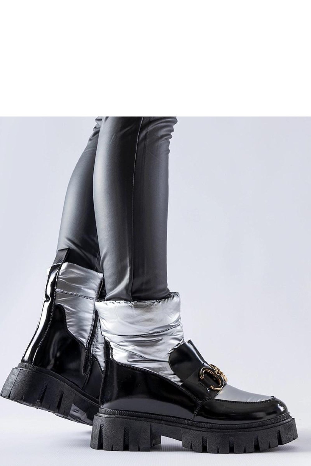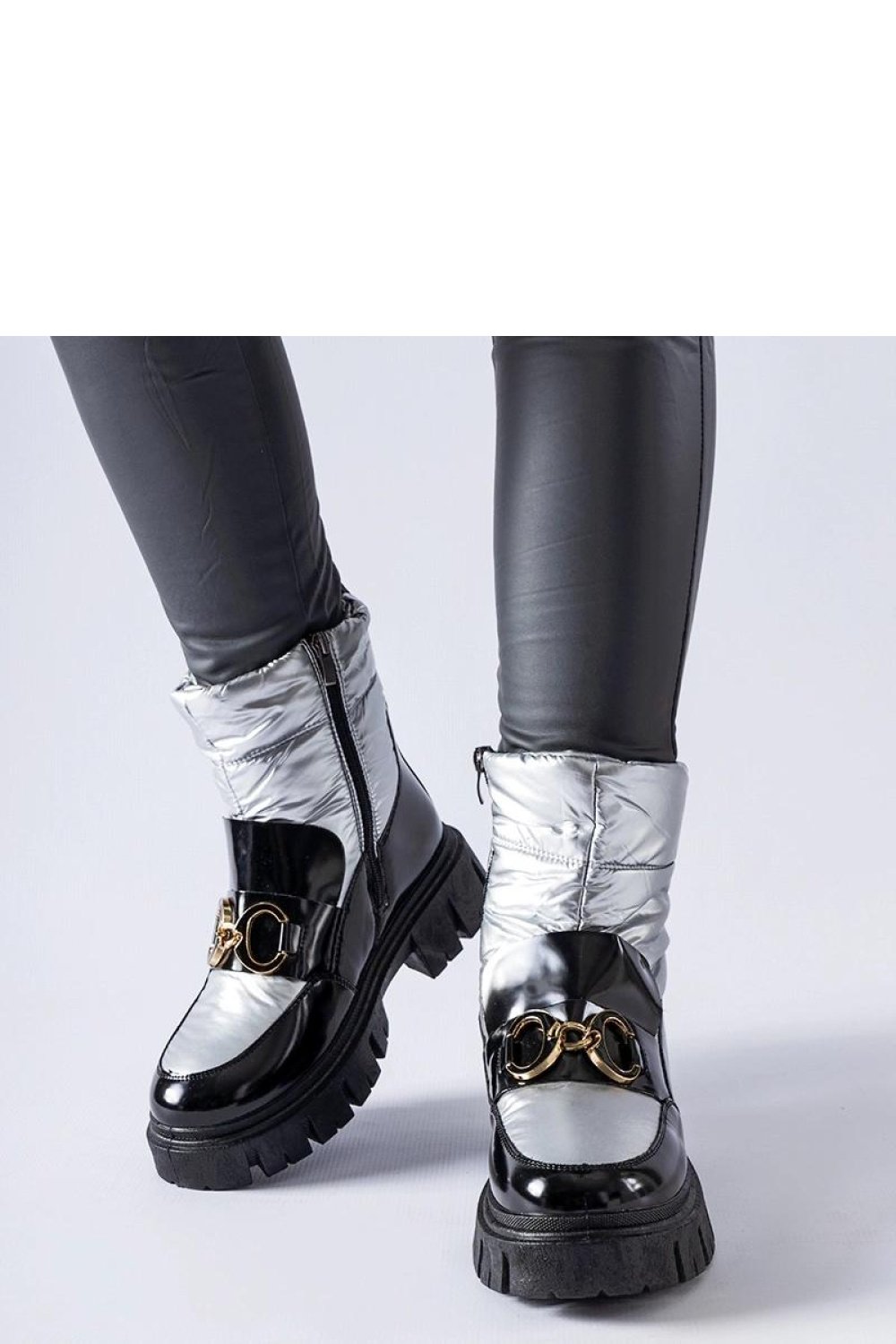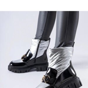 Czarno-srebrne lakierowane śniegowce Winter to doskonały wybór na zimę. Dzięki ocieplanemu wnętrzu zapewniają ciepło nawet podczas najchłodniejszych dni. Ich okrągły nosek nie tylko zapewnia swobodę ruchu dla palców, ale także dodaje elegancji całemu modelowi. Wykonane z wysokiej jakości gumy, są odporne na warunki atmosferyczne, co gwarantuje ich trwałość. Te innowacyjne śniegowce nie tylko są praktyczne, ale także modne, co sprawia, że są niezbędnym elementem garderoby każdej stylowej kobiety. Bez względu na okazję, te buty będą doskonałym uzupełnieniem Twojego stroju zimowego. Zapięcie na zamek ułatwia ich zakładanie i zdejmowanie. Materiał zewnętrzny to tkanina, a podeszwa wykonana jest z czarnej gumy. Te śniegowce pochodzą z kolekcji Jesień/Zima.