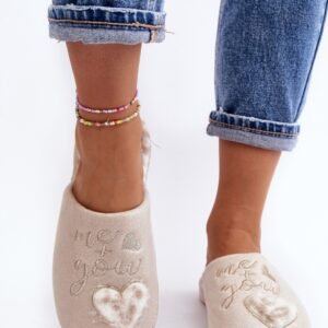 Błyszczące kapcie damskie ozdobione napisem i sercem. Model wsuwany z zakrytym noskiem. Osadzone na grubej podeszwie. Wkładka ocieplona futerkiem.