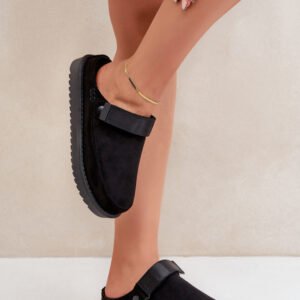 Damskie kapcie na platformie wykonane z eko zamszu to stylowy wybór na chłodne dni. Wnętrze ocieplane miękkim futerkiem zapewni ciepło i komfort. Model posiada zapięcie na rzep, co zapewnia lepsze dopasowanie i zapobiega zsuwaniu się stopy. Świetnie sprawdzą się zarówno w domu, jak i na zewnątrz!