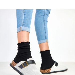 Komfortowe kapcie damskie wykonane z miękkiej tkaniny, z praktycznym okrągłym noskiem i wygodną platformą o wysokości 3,5 cm, która delikatnie podnosi stopę. Model wsuwany, co zapewnia szybkie i wygodne zakładanie. Elegancki akcent stanowi ozdobna sprzączka na przodzie, dodająca kapciom subtelnego stylu i uroku. Wnętrze wykończone jest miękką tkaniną, gwarantując komfort noszenia przez cały dzień. To idealne kapcie do domowego użytku, łączą wygodę z modnym, delikatnym designem.