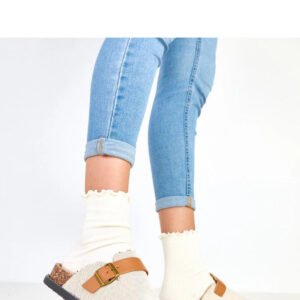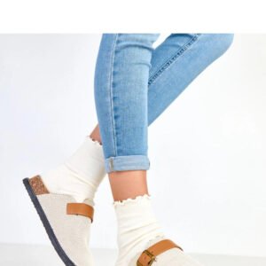Komfortowe kapcie damskie wykonane z miękkiej tkaniny, z praktycznym okrągłym noskiem i wygodną platformą o wysokości 3,5 cm, która delikatnie podnosi stopę. Model wsuwany, co zapewnia szybkie i wygodne zakładanie. Elegancki akcent stanowi ozdobna sprzączka na przodzie, dodająca kapciom subtelnego stylu i uroku. Wnętrze wykończone jest miękką tkaniną, gwarantując komfort noszenia przez cały dzień. To idealne kapcie do domowego użytku, łączą wygodę z modnym, delikatnym designem.