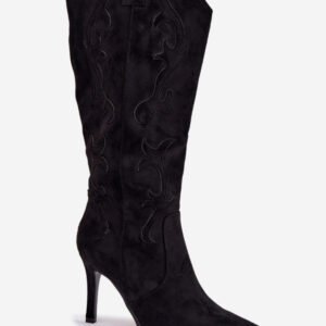 Kozaki damskie wykonane z eko zamszu. Cholewka inspirowana kowbojkami nadaje im charakteru, a smukła szpilka i szpiczaste noski podkreślają kobiecy, zmysłowy fason. Model zapinany na zamek ułatwia zakładanie i zapewnia wygodne dopasowanie. Idealne do stylizacji, które wymagają połączenia elegancji i modowego pazura.
