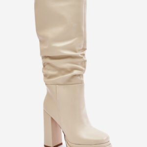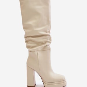Damskie kozaki wykonane z ekologicznej skóry. Osadzone na platformie z obcasem słupkowym, gwarantują stabilność oraz elegancki wygląd. Model jest wsuwany, z zaokrąglonymi noskami. Charakterystyczne dla tego modelu jest marszczenie na cholewce.