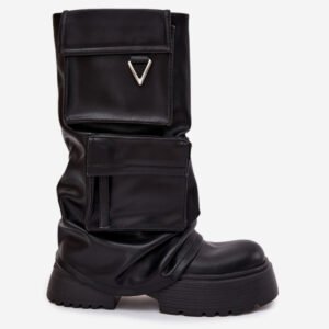 Kozaki damskie wykonane z wysokiej jakości eko skóry to idealny wybór dla kobiet, które cenią nowoczesny design i wygodę. Wsuwany fason ułatwia zakładanie i doskonale dopasowuje się do nogi, a masywna platforma gwarantuje stabilność i komfort podczas noszenia, jednocześnie dodając butom wyrazistego charakteru. Model wyróżnia się efektowną, wywiniętą cholewką oraz kieszeniami, które nadają całości oryginalnego i niebanalnego wyglądu. Stylowy fason sprawia, że kozaki te świetnie wpisują się w aktualne trendy i będą mocnym akcentem w codziennych, miejskich stylizacjach. Doskonale prezentują się zarówno w zestawieniu z dopasowanymi spodniami, jak i z krótkimi sukienkami czy spódnicami.