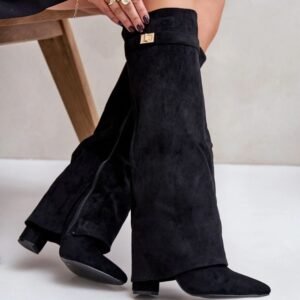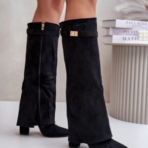 Eleganckie damskie kozaki z ekologicznego zamszu. Osadzone na obcasie w formie słupka. Noski w szpic. Wyjątkowym elementem tego modelu jest wywinięta cholewka z odpinanym paskiem na górze cholewki, która zachodzi na obcas. Zapięcie na suwak. Doskonałe do noszenia z sukienkami lub spódnicami!