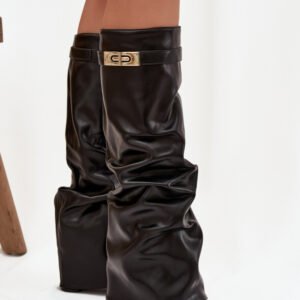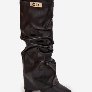 Kozaki damskie wykonane z eko skóry to stylowa propozycja dla kobiet ceniących elegancję w nowoczesnym wydaniu. Model osadzony na stabilnym obcasie typu słupek zapewnia wygodę i pewność kroku, jednocześnie subtelnie wysmuklając sylwetkę. Charakterystycznym elementem jest marszczona cholewka zachodząca na obcas, która nadaje całości wyjątkowego wyglądu. Na górze znajduje się pasek ze złotym elementem, stanowiący elegancki detal. Kozaki są wsuwane, a dodatkowy suwak umieszczony na dole ułatwia zakładanie. Wnętrze ocieplane pianką pokrytą tkaniną gwarantuje komfort termiczny w chłodniejsze dni.